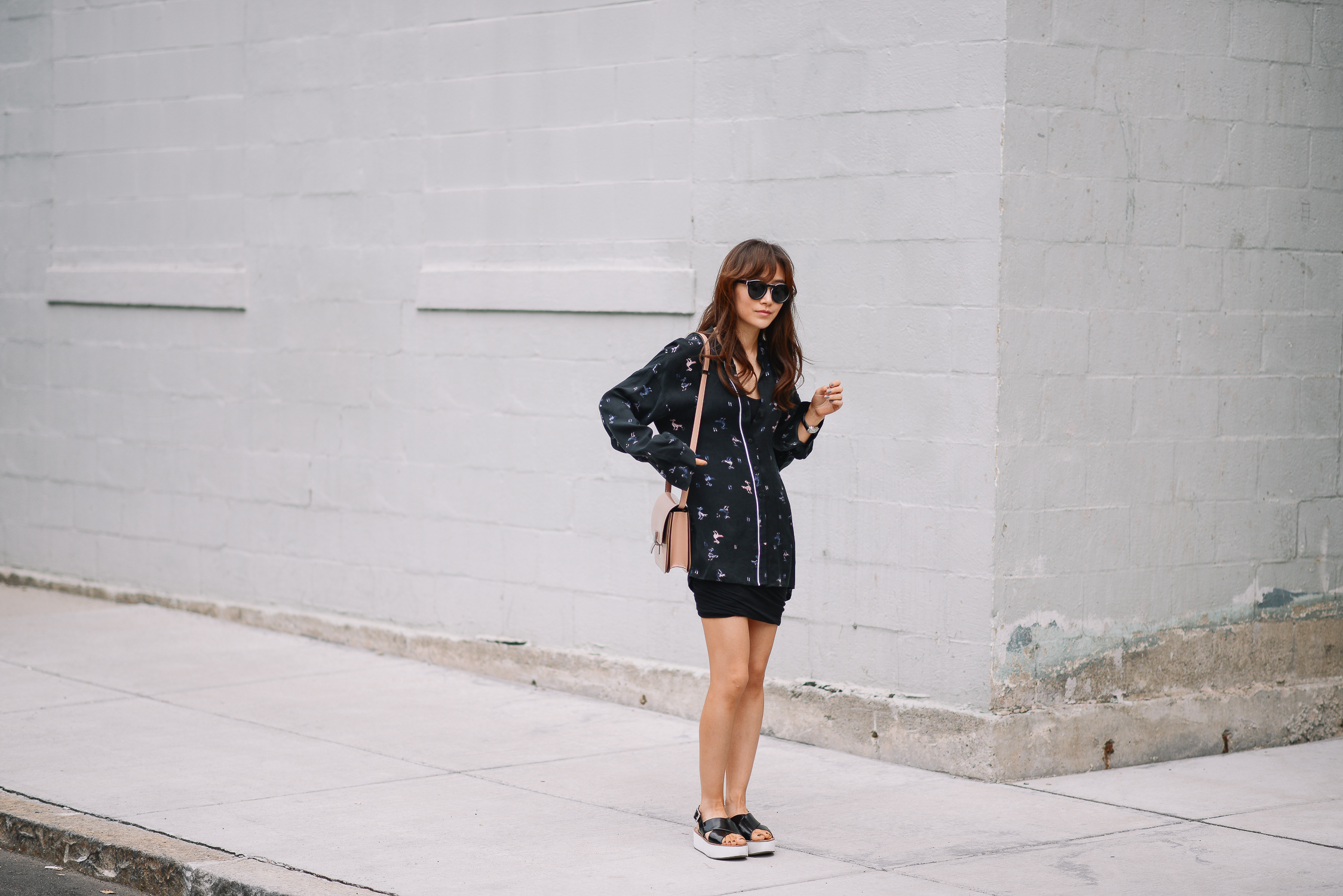 IRO Estrela Drape Skirt | Tibi Print Silk Blouse (sold out, find similar styles below) | ALDO GLORI sandals | Celine MEDIUM CLASSIC BAG IN NUDE | ILLESTEVA LEONARD II TUXEDO SUNGLASSES